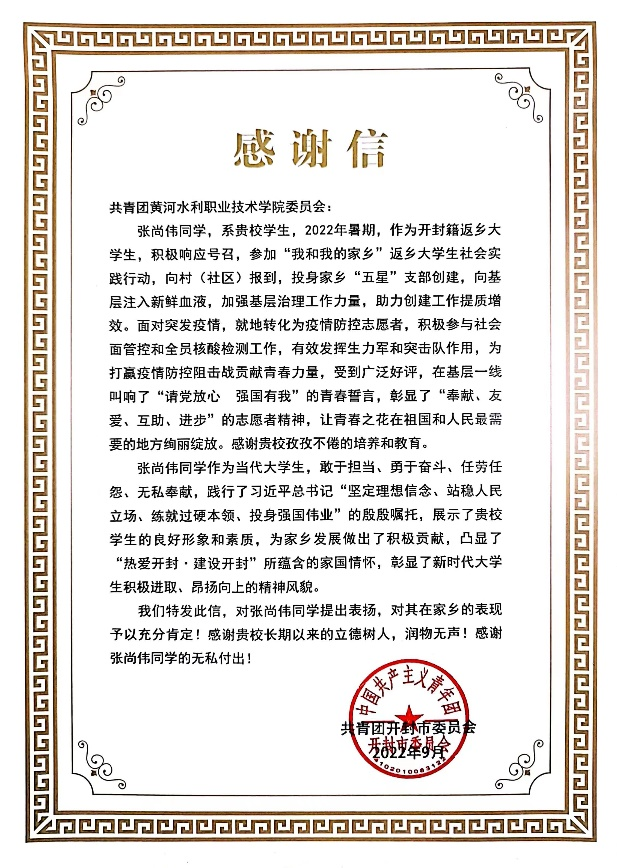 张尚伟同学作为当代大学生,敢于担当、勇于奋斗、任劳任怨、无私奉献,践行了习近平总书记“坚定理想信念、站稳人民立场、练就过硬本领、投身强国伟业”的殷殷嘱托,展示了信息工程学院学生的良好形象和素质,为家乡发展做出了积极贡献,凸显了“热爱开封、建设开封”所蕴含的家国情怀,彰显了新时代大学生积极进取、昂扬向上的精神风貌。