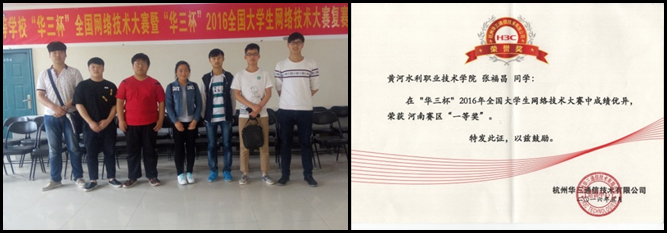 (曹建春、杜鹃、马莉、马海洲等指导教师组织学生参加20余名“华三杯”2016年全国大学生网络技术大赛并取得优异成绩,其中一等奖1人,2等级4人,三等2人)