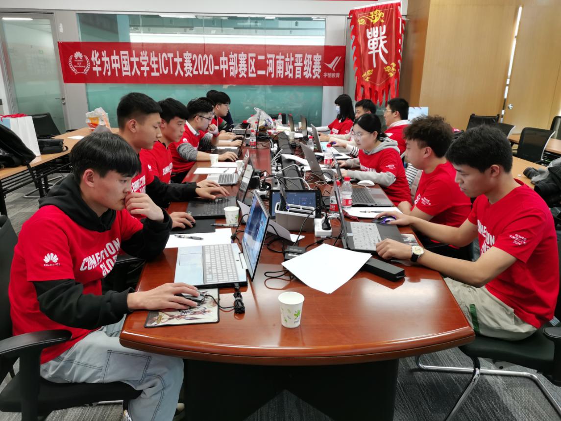 “华为ICT大赛”是华为公司面向全球大学生打造的ICT人才竞技交流赛事,分为实践赛和创新赛。其中,实践赛包含网络赛道和云赛道,主要培养和考察大学生ICT理论知识储备量、上机实践能力和团队协作能力,每个代表队由来自同一所高校的3名同学组成。经过资格赛和加分赛等阶段的层层筛选,我校两个赛道代表队队员艰苦奋战、查漏补缺、密切配合,最终在中部二赛区河南站晋级赛网络赛道和云赛道中力拔头筹,并成功入围华为ICT大赛全球决赛。