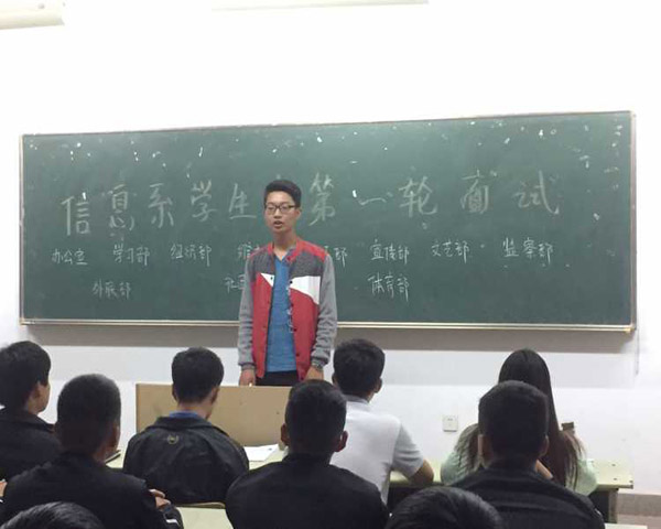 为了进一步促进学生会工作,巩固和完善学生会的工作机制,更好的服务于同学,我系于10月9日晚八点在教学楼3601、3602、3603教室举行学生会招新面试。由大二学生会代表主持,我系学生会主席团及各部门负责人和参加面试的15级新生出席本次会议。