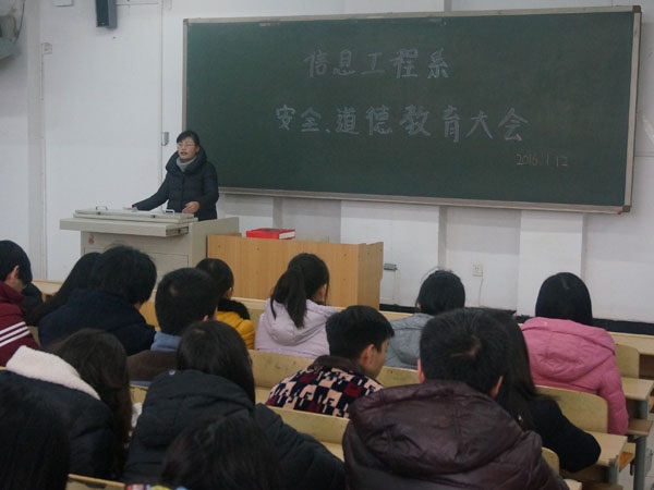 为 加强同学们的安全和道德意识,督促学生做到端正态度、诚信考试,我系于1月12日13:00时,在jx2202教室召开2014级安全道德教育大会。会议由14级辅导员张瑞青主持,系副书记殷莺老师出席了此次大会。