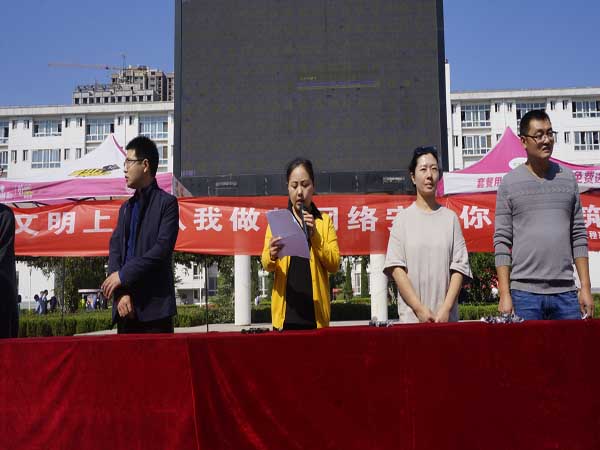 活动开始,丁爱萍书记发表重要讲话:她指出互联网是一把“双刃剑”,为大学生成长开辟广阔空间的同时,也带来了前所未有的挑战和威胁,如何营造一个有利于大学生健康成长的网络环境,已经成为一个国际难题,要以“大学生网络文明公约”启动为契机,不断弘扬社会主义核心价值观,自觉践行社会主义荣辱观,进一步凝聚网络文明共识,要求同学们树立正确网络观,坚持理性自律,倡导文明表达,调动各方面积极性,创建文明网络。
