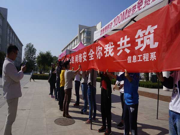 为进一步推进校园文明上网与精神文明建设,巩固我校全国精神文明单位称号。9月29日中午我系在大屏幕下隆重举行了“文明上网从我做起,网络安全你我共筑”主题教育活动暨签名仪式。我系党总支书记丁爱萍、副书记殷莺、分团委书记彭战松、15级辅导员蒋晓絮、16级辅导员贾红军出席了本次活动。本次活动由15级辅导员蒋晓絮主持,大一大二全体学生参加。