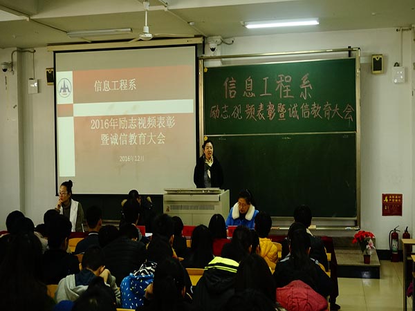 2016年12月8日中午1时,我系在JX6202教室召开了励志视频表彰及诚信教育大会,会议由蒋晓絮老师主持,我系副书记殷莺、分团委书记彭战松、14级辅导员张瑞青出席了此次会议,2015级、2016级全体受助学生参加了此次会议。