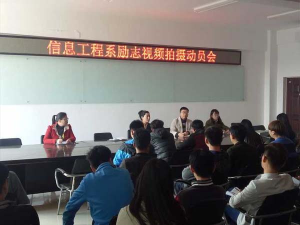 为了提升同学们学习热情,扩展学生专业技能,我系于2017年3月14在SY5508召开信息工程系励志视频拍摄动员会,会议由信息工程系党总支副书记殷莺组织,全体辅导员老师,各班班长团支书、优秀学生代表参加。