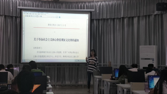 为响应学校号召,加强和改进思想政治工作,以社会主义核心价值体系引领大学生思想政治道德建设,创新思想政治道德的形式和方法。我系于2017年5月17日上午11:40在SX4407A召开“社会主义核心价值观”主题征文比赛动员会, 本次会议由15级辅导员蒋晓絮老师组织,15级全体同学参加。