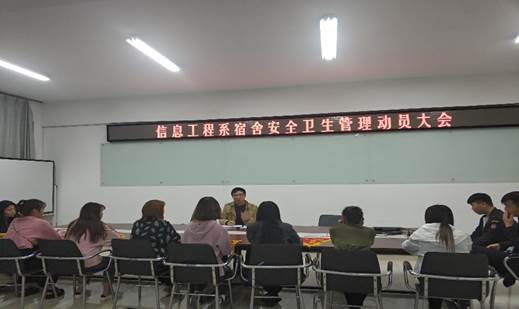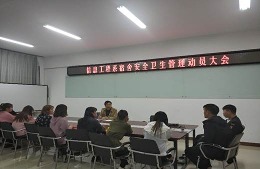 为了构建安全、卫生的学生寝室,让同学们形成寝室安全意识并养成良好的生活习惯,4月16日18点40,信息工程系在实训楼5508会议室召开宿舍卫生安全动员大会,此次会议由贾红军老师主持,维权部与女工部骨干成员也参加此次会议。
