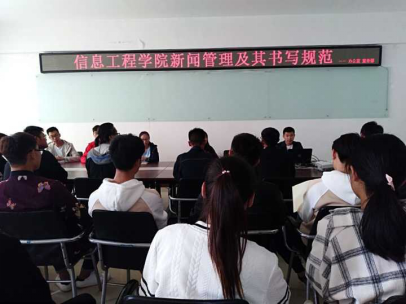 为了加强我院新闻报道的管理及书写新闻的规范,10月22日中午,信息工程学院在SX5508会议室召开信息工程学院新闻管理及其书写规范会议。参加会议的人员有:信息工程学院18级辅导员牛婉老师,办公室新闻负责人刘祥麟,宣传负责人黄玉洁、许怡梦,以及办公室助理(新闻方面)、宣传部全体成员、学生会各部室代表。