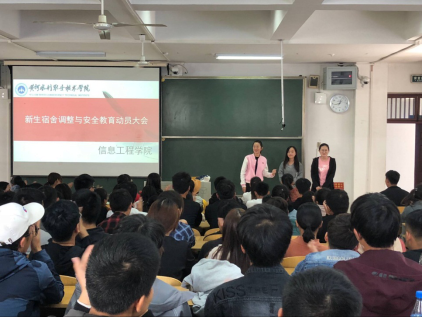 为了加强宿舍管理和安全教育,10月23日中午,信息工程学院在JX6202和JX6302召开新生宿舍调整与安全教育动员大会。本次会议有信息工程学院蒋晓絮老师,信息工程学院2016级辅导员贾红军老师,2018级辅导员李苗老师、牛婉老师,以及2018级全体新生参加。