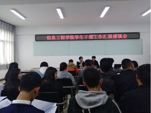 11月7日中午12点30分,信息工程学院全体学生干部在实训楼5508会议室召开学生干部工作汇报座谈会,会议由学生会负责人魏玉硕、刘潇涵主持。
