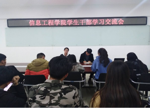 11月7日1点30分信息工程学院在实训楼5508会议室召开学生干部学习交流会,我院学生会主席团及各部部长参加本次交流会。
