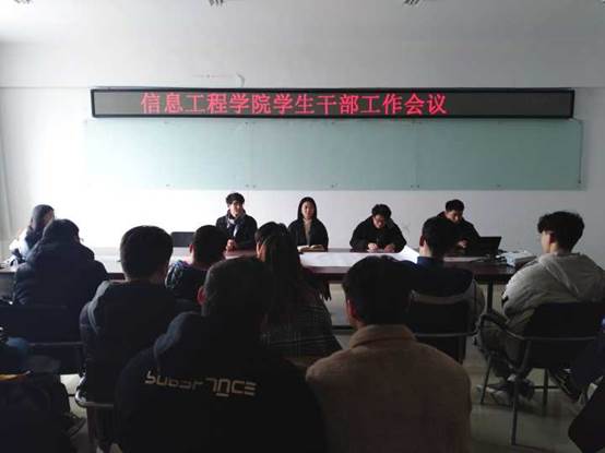 2月26日下午,信息工程学院分团委负责人蒋晓絮老师、学生会主要干部及各部室负责人,在sy5508办公室召开了新学期信息工程学院学生干部工作会议,此次会议由蒋晓絮老师主持。