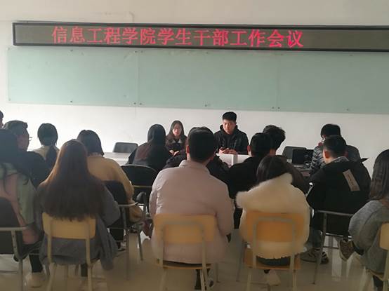 2月27日中午信息工程学院在sy5508会议室召开新学期第一次学生会工作会议。会议由学生会干部魏玉硕和常文莹主持。出席会议的还有学生会全体成员。