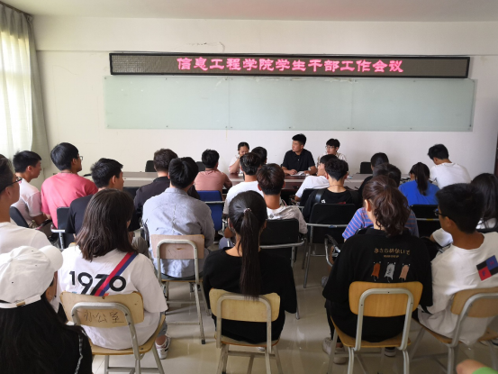 信息工程学院于5月29日中午在SY5508会议室召开第十四周学生干部工作例会,会议由分团委书记高欣老师主持,参会人员有学生会主席魏玉硕、学生会副主席刘潇晗以及学生会各部室部长和2018级各班班长、团支书。