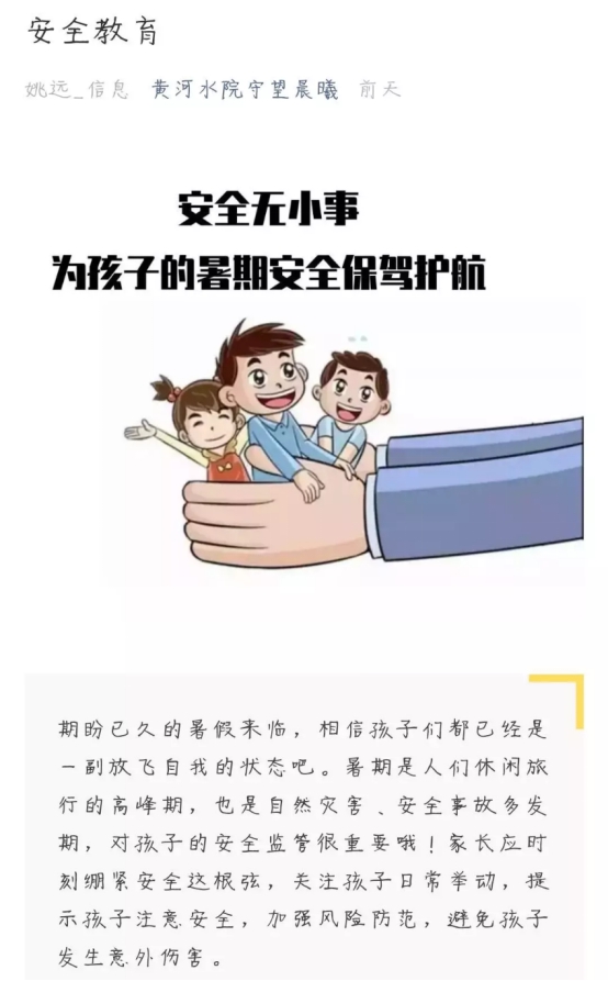 同时为了更好的帮助留守儿童,关爱留守儿童,小分队组成暑期临时团支部,利用本学院专业技能开创“守望晨曦”教育微信公众号平台,邀请老师与家长们进行关注,及时为孩子和家长们更新各类安全知识,促进安全常识的普及,避免各类安全事故的发生,为孩子们保驾护航,并组织本院各团支部开展微心愿认领活动,让大家充分发挥自己的特长帮助留守儿童实现一个小心愿,把温暖送到留守儿童身边去。