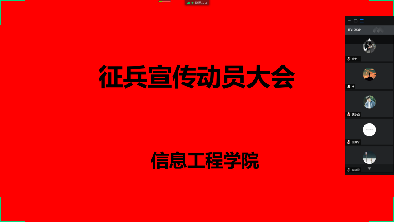 为进一步推进学院2020年征兵宣传工作,6月12日下午信息工程学院2019级辅导员分别召开线上征兵宣传动员大会。