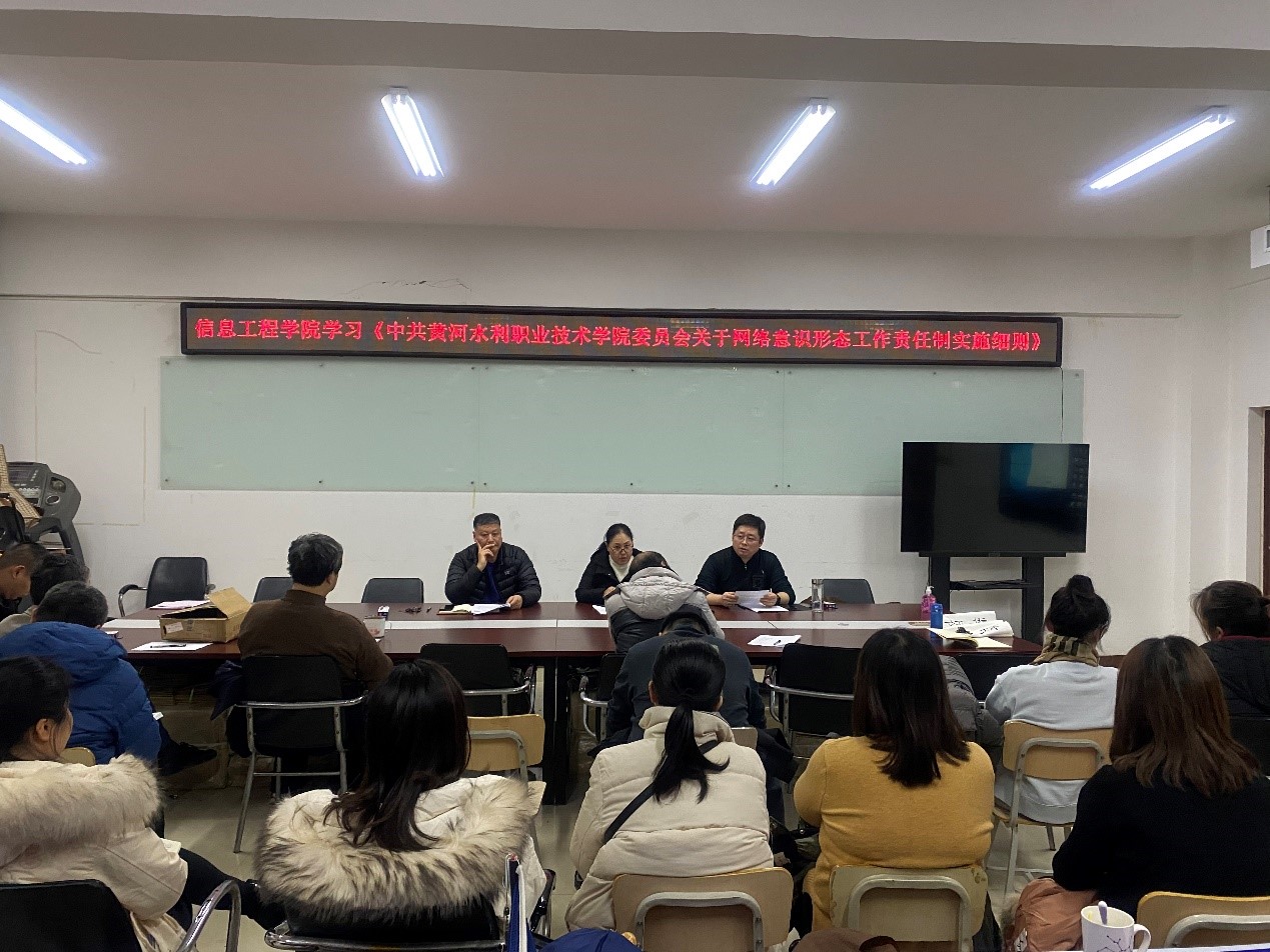 随后,由副院长曾赟组织大家共同学习《关于印发《中共黄河水利职业技术学院委员会网络意识形态工作责任制实施细则》的通知》,曾赟表示,互联网已经成为意识形态斗争的主战场、主阵地、最前沿,网络意识形态工作是意识形态工作的重中之重,希望老师们提高认识,杜绝重大网络舆情的发生。