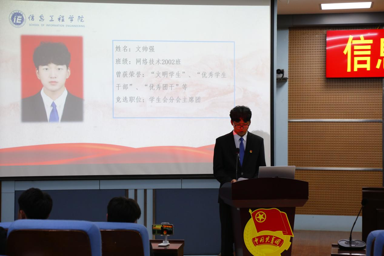 出席本次大会的各位领导有校团委副书记郝黎闻、信息工程学院党总支书记罗朝峰、副书记李晓娟、副院长曾赟、信息工程学院分团委书记何昕。出席本次大会的嘉宾有19级辅导员孙远灿、陈文静,20级辅导员张家兴、程凯,21级辅导员牛婉,