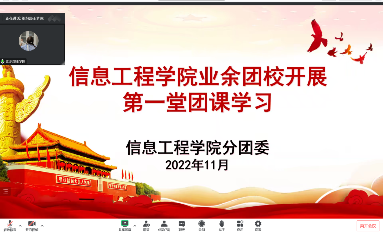 为深入学习宣传贯彻党的二十大精神,学习贯彻习近平总书记视察陕西延安和河南安阳重要讲话精神。信息工程学院于2022年11月20日晚上以线上的形式顺利开展2022-2023学年第一学期业余团校第一堂团课。此次会议由分团委何昕老师为团校全体学员进行团校第一堂团课的讲解。