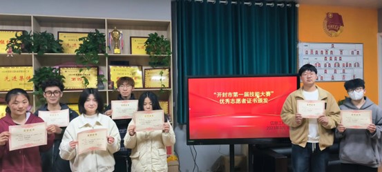 首先,会议表彰了在开封市第一届技能大赛工作中表现突出的志愿者们,并为他们颁发了荣誉证书及奖励。接着,分团委何昕老师向受到表彰的学生们表示热烈的祝贺,并对所有学生会干部以及志愿者们的辛勤工作给予了充分肯定,并鼓励22级同学积极参加青年志愿者活动。