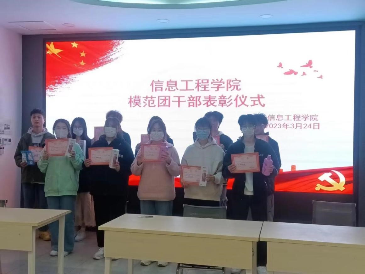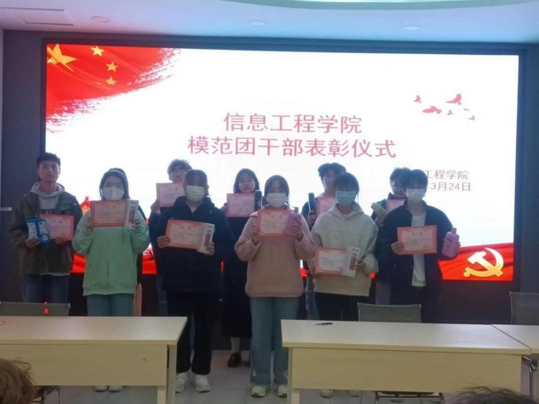 为深入贯彻落实党的二十大精神,进一步规范学院团支部建设,展示团学干部的良好精神风貌以及促进基层团支部工作的有序开展,表彰在2022年基层团支部述职评议中的先进个人,信息工程学院于2023年3月24日晚上七点在SY4405C开展了2022年基层团支部述职评议模范团干部表彰大会,对2022年表现突出的模范团干部做出嘉奖。