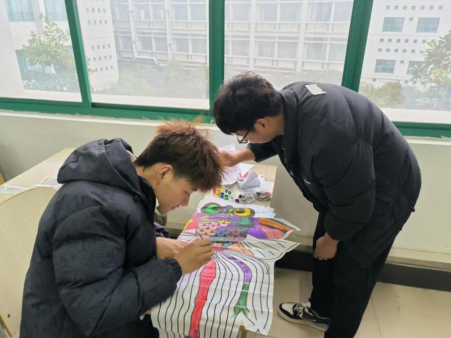 手绘环节,同学们两三人自由组合为一组开始着手制作风筝,同学们挥动手中的画笔,手绘出美丽的特色风筝,栩栩如生的动物、色彩斑斓的植物、亲切可爱的卡通形象在他们的画笔下活灵活现。