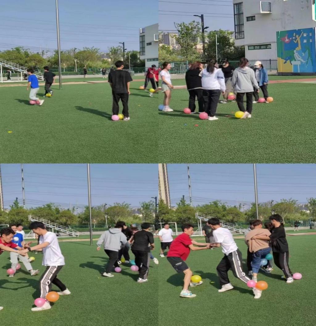 一个班级出5个人,一个人脚上绑两个气球,在规定范围内限时三分钟,不能用手互推,哪组气球剩余最多哪组就获胜,或者谁先把对方气球踩完谁获胜。游戏最后两个班获胜的同学进行比拼,规则同上,决出第一名。