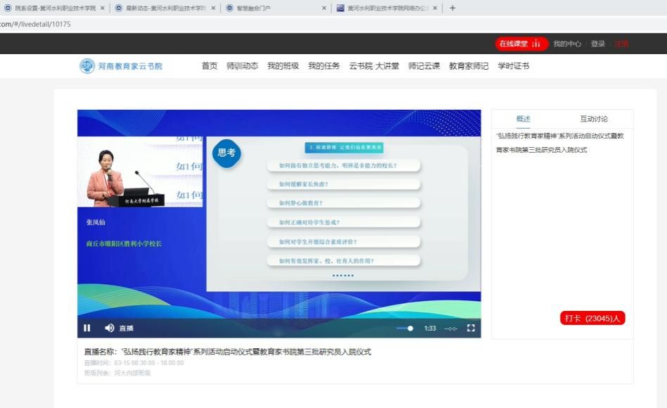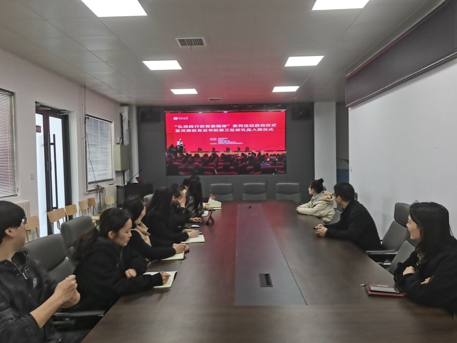 2024年3月15日上午8:30在SY4426会议室组织没有授课及工作任务的教师集中观看“弘扬践行教育家精神”系列活动启动仪式,并收看学习了河南教育家书院执行院长王萍的《河南教育家书院弘扬教育家精神的实践经验》报告等。