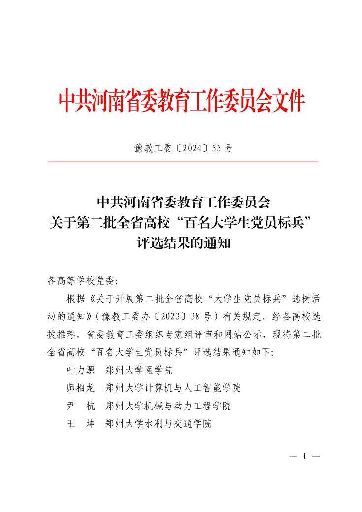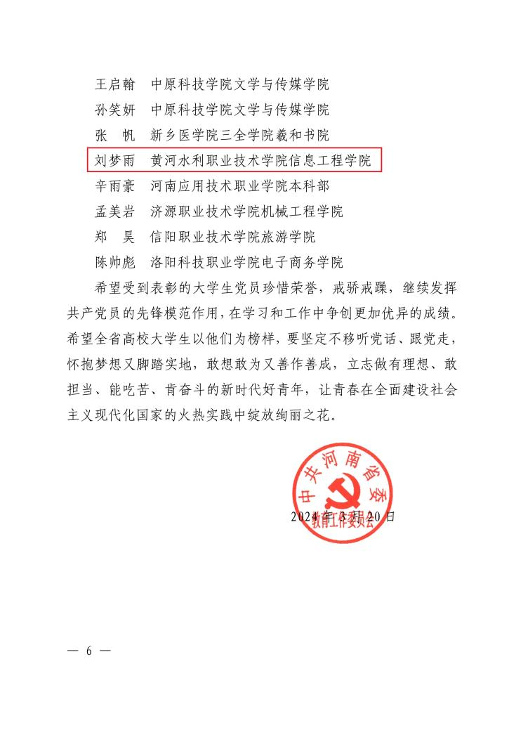 近日,中共河南省委教育工委公布了《关于第二批全省高校“百名大学生党员标兵”评选结果的通知》(豫教工委〔2024〕55号),信息工程学院学生党员刘梦雨荣获全省高校“大学生党员标兵”荣誉称号。