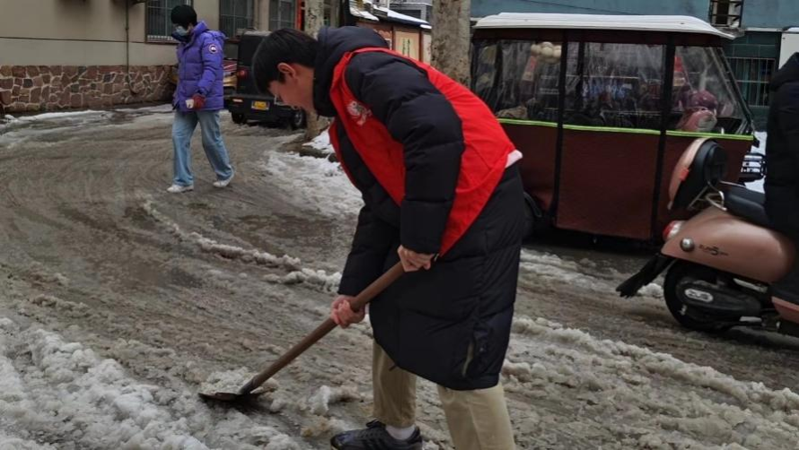 与此同时,信息工程学院计算机应用2301班的李桂柯同学也积极参与了社区组织的志愿服务活动,保障社区居民的日常出行安全。李桂柯同学正奋力清扫马路上的积雪。尽管天气严寒,但他的热情丝毫未减。他手持铁锹,一点一点地清除路上的积雪,为社区居民的出行安全提供了坚实的保障。