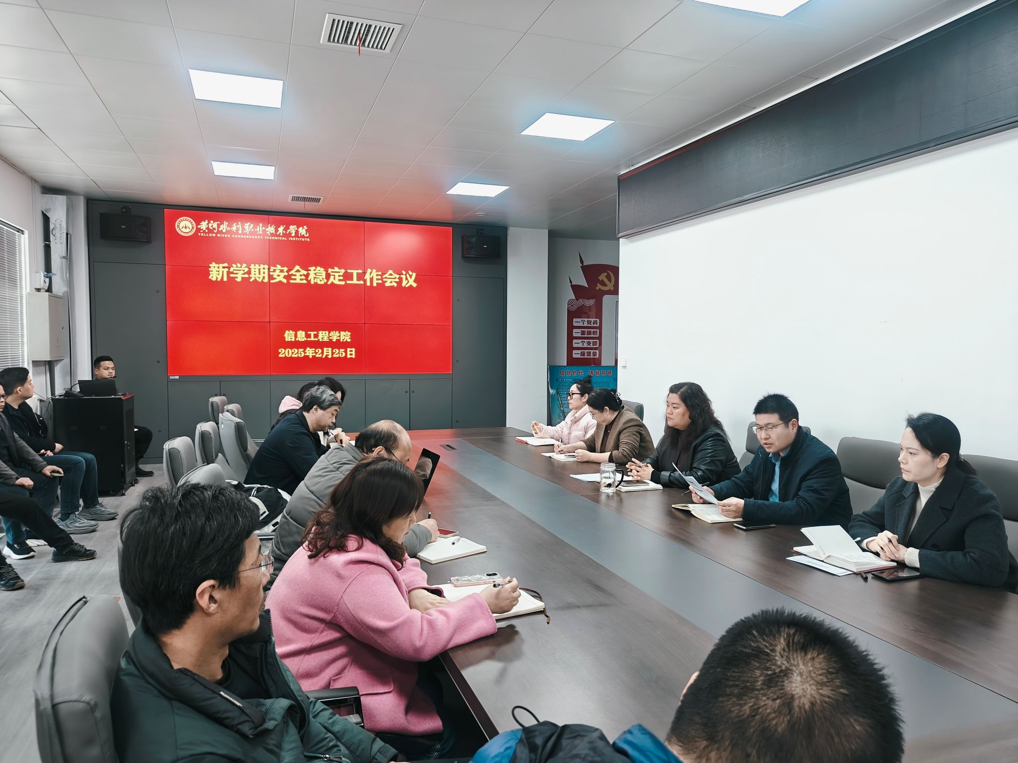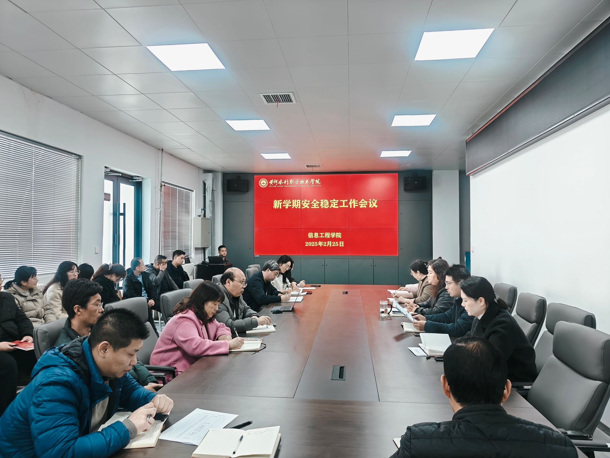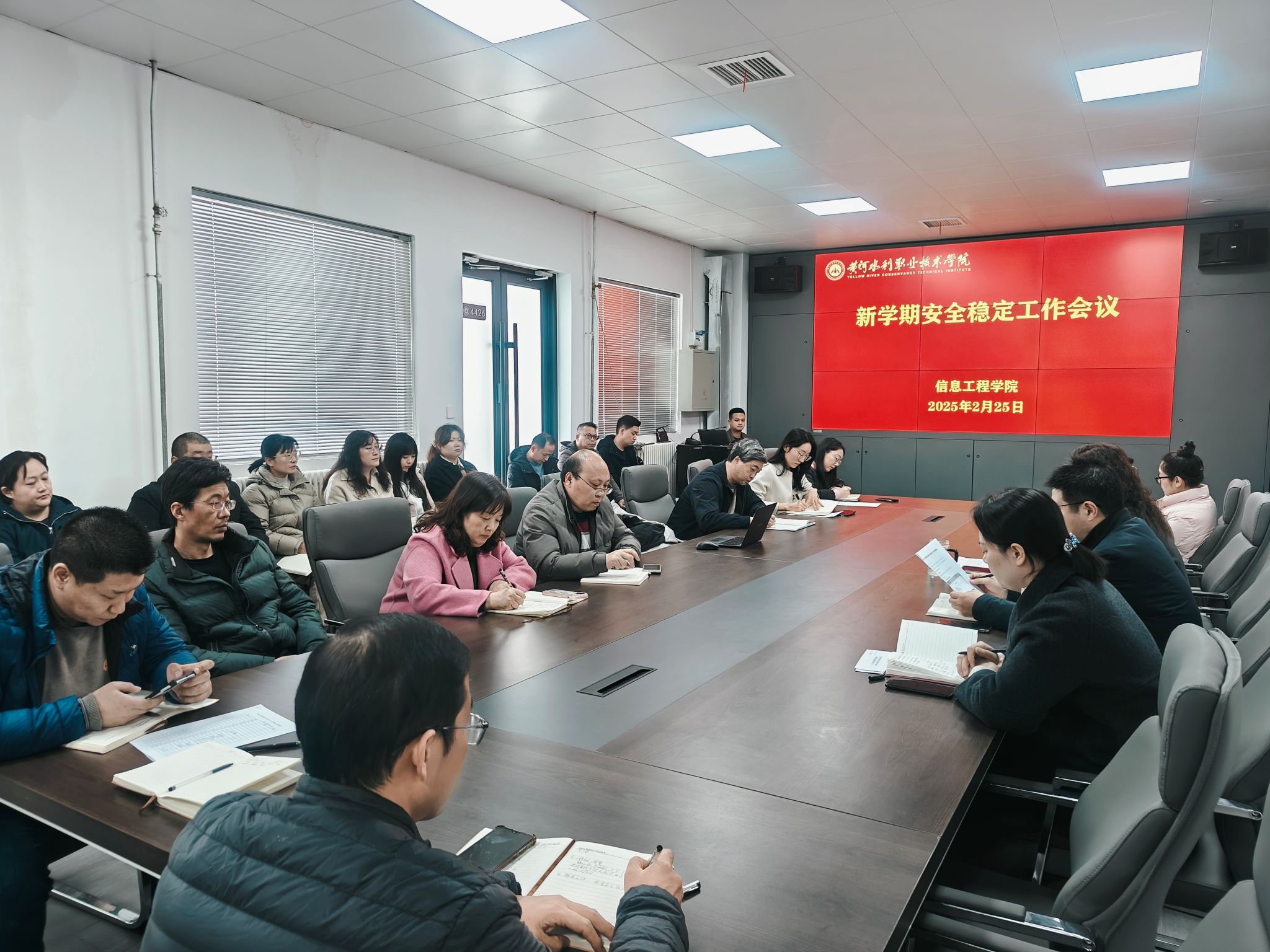 为贯彻落实学校关于新学期安全稳定工作的部署要求,进一步加强学院安全管理工作,确保师生生命财产安全和校园的和谐稳定,2025年2月25日,信息工程学院在SY4426会议室召开安全稳定工作会议。学院全体教职工参加了会议。