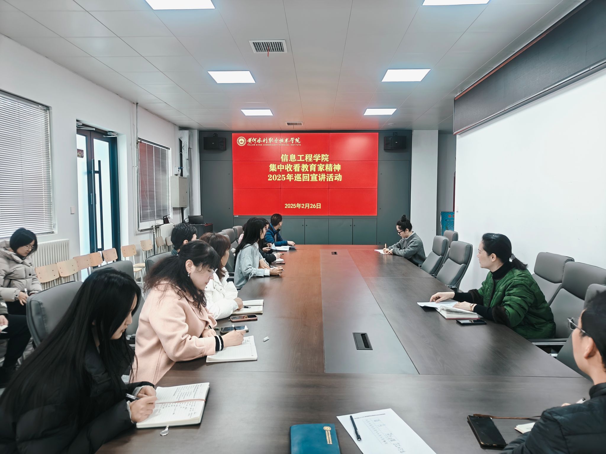 2025年2月26日上午9:00,信息工程学院组织教师在SY4426会议室集中收看了教育家精神2025年巡回宣讲活动。此次宣讲活动由教育部组织,旨在深入学习贯彻习近平总书记关于教育的重要论述,弘扬教育家精神,加强新时代高素质专业化教师队伍建设。