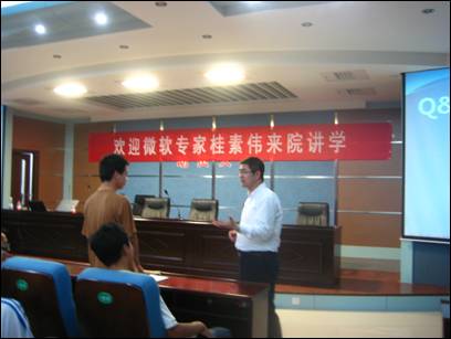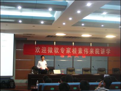 2010年6月3日晚,微软C#方向MVP(微软全球最有价值专家)桂素伟老师应邀,在水利系学术报告厅为我系200余名师生作《Visual Studio亲密接触》的技术讲座。讲座由系工学办主任张辉主持。