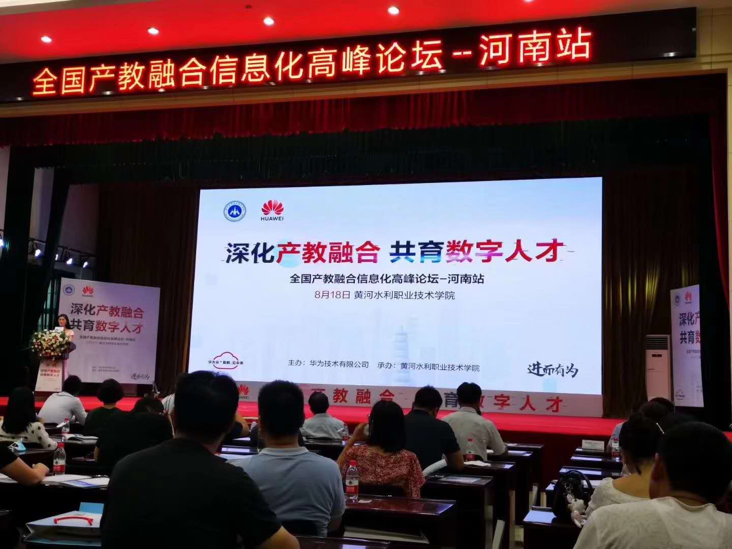 为进一步贯彻落实《国家职业教育改革实施方案》,深化产教融合,推进校企合作,共育数字人才,2020年8月18日,由我校承办的2020全国产教融合信息化高峰论坛(河南站)在我校学生活动中心举办。本次高峰论坛由华为技术有限公司主办,以“深化产教融合,共育数字人才”为主题,围绕“高职信息化建设应用与实践”“产教融合数字人才培育”“ICT产业学院发展之路”等方面,分享优秀典型院校经验,交流与探讨创新技术,推动职业教育及高水平应用型数字人才的培养。本次高峰论坛有全省40多所兄弟院校的校领导、二级学院领导和专任教师参加。华为技术有限公司河南政企业务部副总经理李博代表华为致辞,我校副校长菅浩然代表我校致欢迎辞,我校信息工程学院党总支书记罗朝峰、院长丁爱萍以及骨干教师20多人参加了会议。