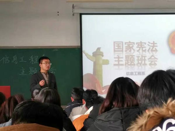 2016年12月2日至8日期间,我系各年级辅导员分别组织召开了“学习宪法、贯彻宪法”主题班会,全体学生参加宪法学习。主题班会上,辅导员详细向全体同学讲解了宪法的重要意义,学习了《2016年宪法晨读内容》。