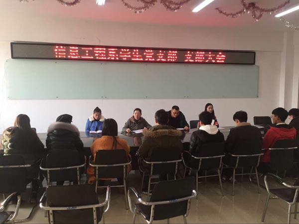 12月6日下午3:30,信息工程系学生党支部在SY5508召开支部大会。信息工程系副书记殷莺、学生党支部书记彭战松、2014级辅导员张瑞青、2015级辅导员蒋晓絮以及全体学生党员以及2016年下半年党员发展对象参加。