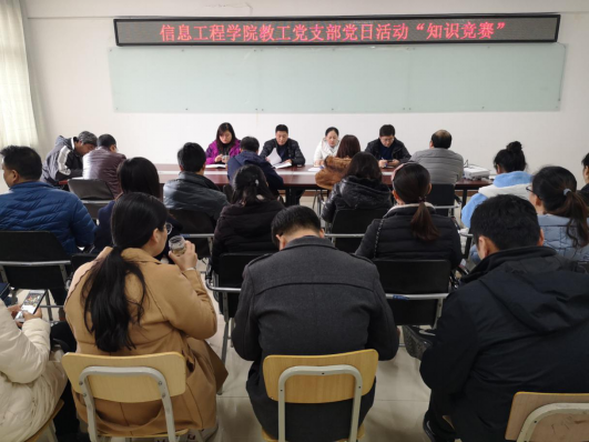为全面贯彻学习十九大精神,信息工程学院于2018年11月20日下午,举行了学院十九大精神学习一周年知识考试,所有教职工党员同志们及学生党员、入党积极分子,都登录各支部的智慧课堂参加答题,活动评出一等奖2 个,二等奖 5个,三等奖 8个,优秀奖40 个。