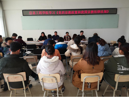 2018年12月18日下午在信息工程学院会议室召开全体教职工学习会议,组织学习《党的宗教政策和我国宗教法律法规》文件精神。会议有党总支书记罗朝峰主持。
