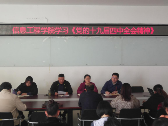 2019年11月5日下午,信息工程学院在SY5508会议室,组织全体教职工开展政治学习,此次学习内容为十九届四中全会精神,会议由党总支书记罗朝峰主持。会议内容上深入学习习近平总书记在党的十九届四中全会上的重要讲话和全会精神,研究贯彻落实十九届四中全会精神有关工作。