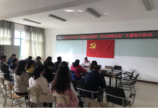 为进一步把主题教育工作抓紧抓实、引向深入,推动主题教育和业务工作深度融合,用主题教育学习成果推动学院及学校事业发展,根据《中共黄河水利职业技术学院委员会“不忘初心、牢记使命”主题教育工作实施方案》(黄院党[2019]41号)文件通知要求,信息工程学院于10月17日上午组织开展“弘扬革命精神、坚定理想信念”党日活动。此次活动由教工支部书记杜娟主持。