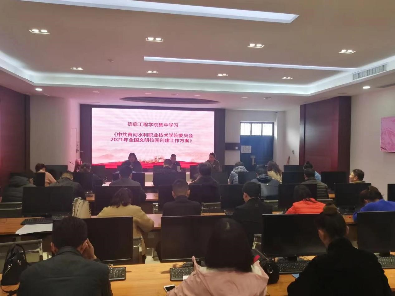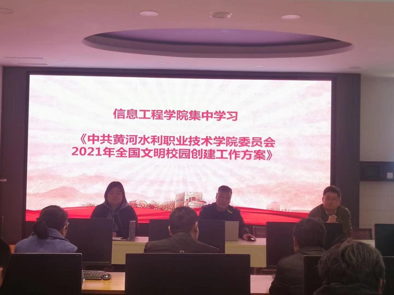 为贯彻落实《黄河水利职业技术学院2021年全国文明校园创建工作方案》文件精神,有序、保质保量推进信息工程学院“文明校园”创建工作,3月30日下午在实训楼4405C召开了信息工程学院“文明校园”创建工作推进会,会议由学院党总支书记罗朝峰主持、党总支副书记李晓娟、副院长曾赟以及信工学院体教职工参加了此次会议。