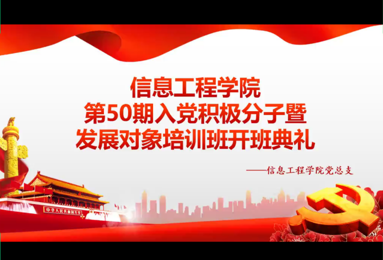 为做好入党积极分子和发展对象的教育培训工作,进一步加强同学们的党性修养,信息工程学院于2021年11月13日下午以线上线下相结合的方式在SY4409B1及腾讯会议举行第五十期入党积极分子暨发展对象培训班开班典礼,党总支书记罗朝峰,党总支副书记李晓娟,学生党支部书记何昕,全体辅导员及五十期全体入党积极分子和发展对象参加。