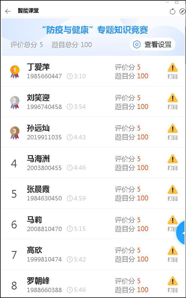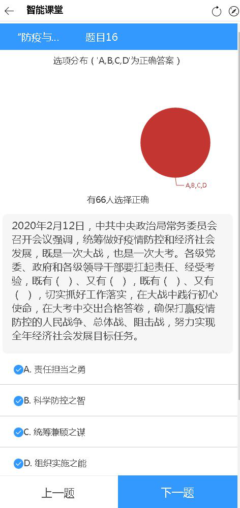为了检验学习效果,3月17日下午,信息工程学院教工支部开展了线上“防疫与健康”专题知识答题竞赛党日活动,全体教工党员、入党积极分子、部分教职工积极参加此次活动此次答题竞赛通过智能课堂在线答题的方式展开,随机从题库中生成试卷,试卷包含单选、多选和填空题。本次竞赛答题主要涵盖疫情期间习近平总书记关于疫情防控工作的重要指示、疫情的基本认识、如何做好个人防控的基本措施以及疫情期间的榜样人物事迹等内容和知识点。