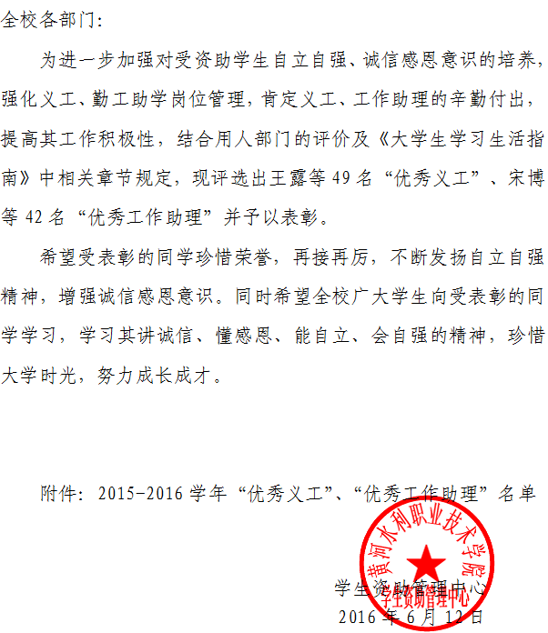 关于表彰“优秀义工”、“优秀工作助理”的决定