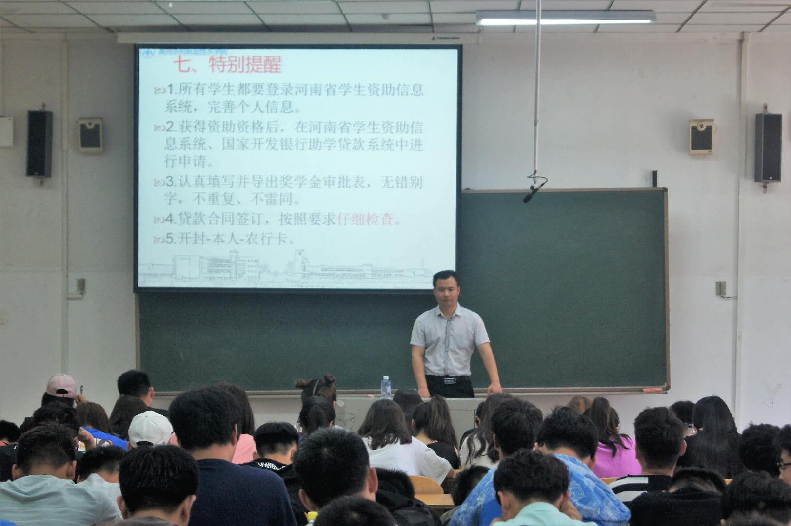 本次活动宣讲的内容主要包括国家资助政策如何帮助家庭经济困难学生;国家奖助学金、校内奖助学金申请条件、评审办法、评审过程、发放结果等;国家助学贷款的申请流程、需要提交的材料、还款流程、注意事项等;为方便大家理解,还为大家列举了一系列典型案例,并为学生现场解答。不仅落实了资助政策“两节课”要求,让更多的家庭经济困难学生感受到国家和学校的关怀,增加了他们自立自强、感恩回馈的意识,同时使我校广大在校学生对国家和校内各项资助政策及具体措施有了更深层次的认识,达到了良好的宣传效果。