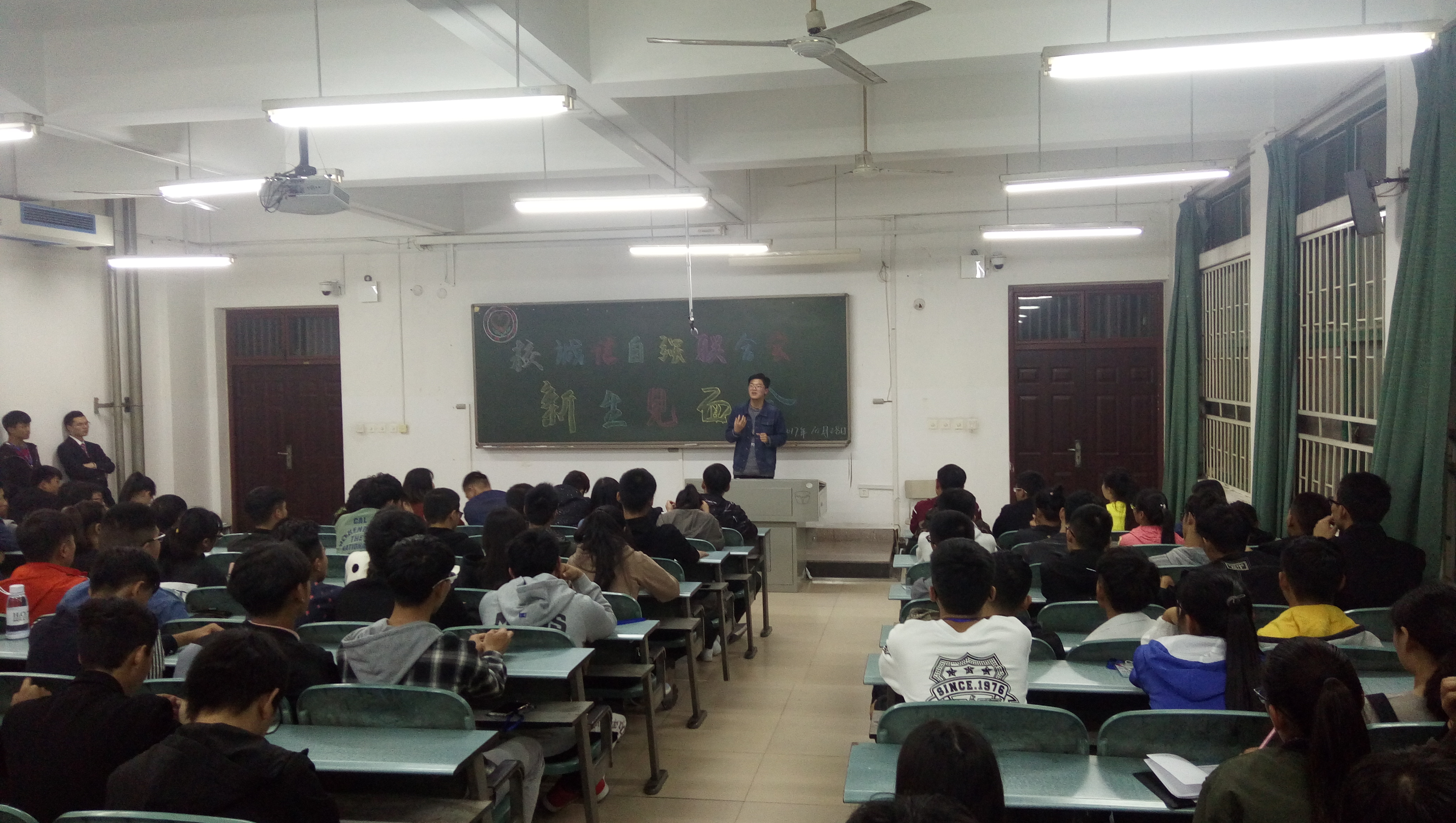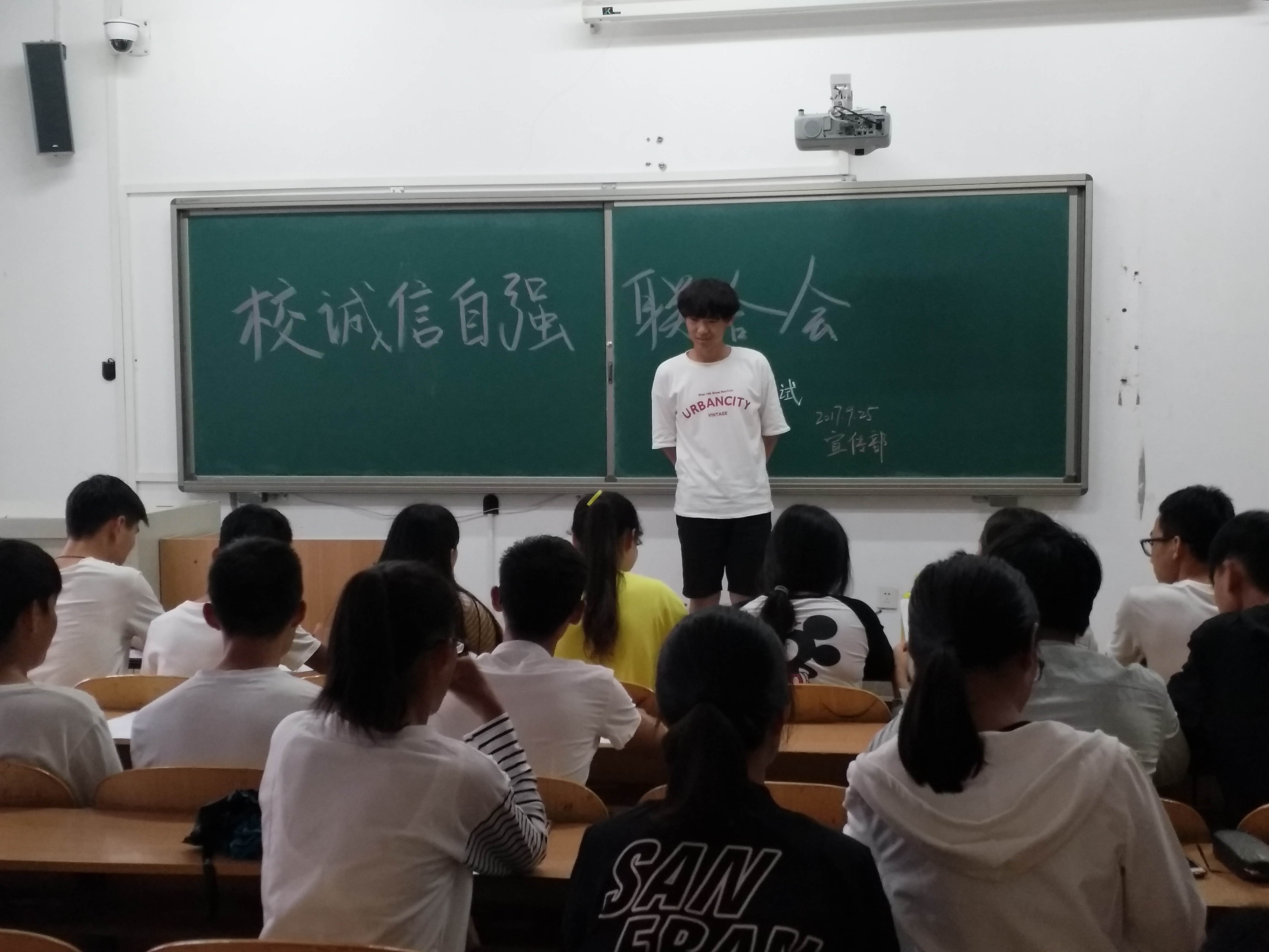 2017年10月28日晚校诚信自强联合会在jx4201举办第十一届校诚信自强联合会新生见面会,联合会六个部室齐聚在一起。新生见面会首先以影集的方法向大家展示了联合会全体成员近一年共同努力的点点滴滴,一同体验这大家庭的难忘瞬间。然后联合会主席王际乐以致辞的方式向大家讲述了自己从刚刚进入大学加入联合会到最后成为联合会主席的心得体会,希望大家可以不忘初心,实现自身的价值,让自己的大学生活发光发彩。最后联合会副主席李志远介绍了联合会的创建缘由、部室情况以及由联合会主办的各项活动,分享了自己进入大学之后的经验以及对新生的一些忠告。会议期间全体委员都认真听讲,大会结束后各个部室互相交流并留影纪念。