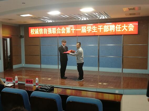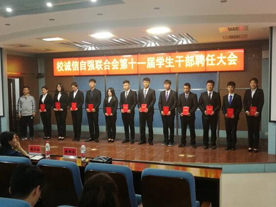 承前启后秀精彩,继往开来展宏志。4月23日校诚信自强联合会在3号实训楼学术报告厅举行第十一届学生干部聘任大会。出席本次大会的有学生处副处长霍卫红、联合会指导老师董新法、学生资助管理中心陈思、以及各院系资助助理,参加此次活动的还有诚信自强联合会全体成员。