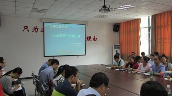 资助培训工作会议开始后学生处处长谷献晖讲到“为了进一步加强国家资助政策宣传力度,帮助我校在校学生进一步了解国家资助政策,确保每位学生不因家庭经济困难而影响学业,引导学生有上进心,激励学生积极进取”。