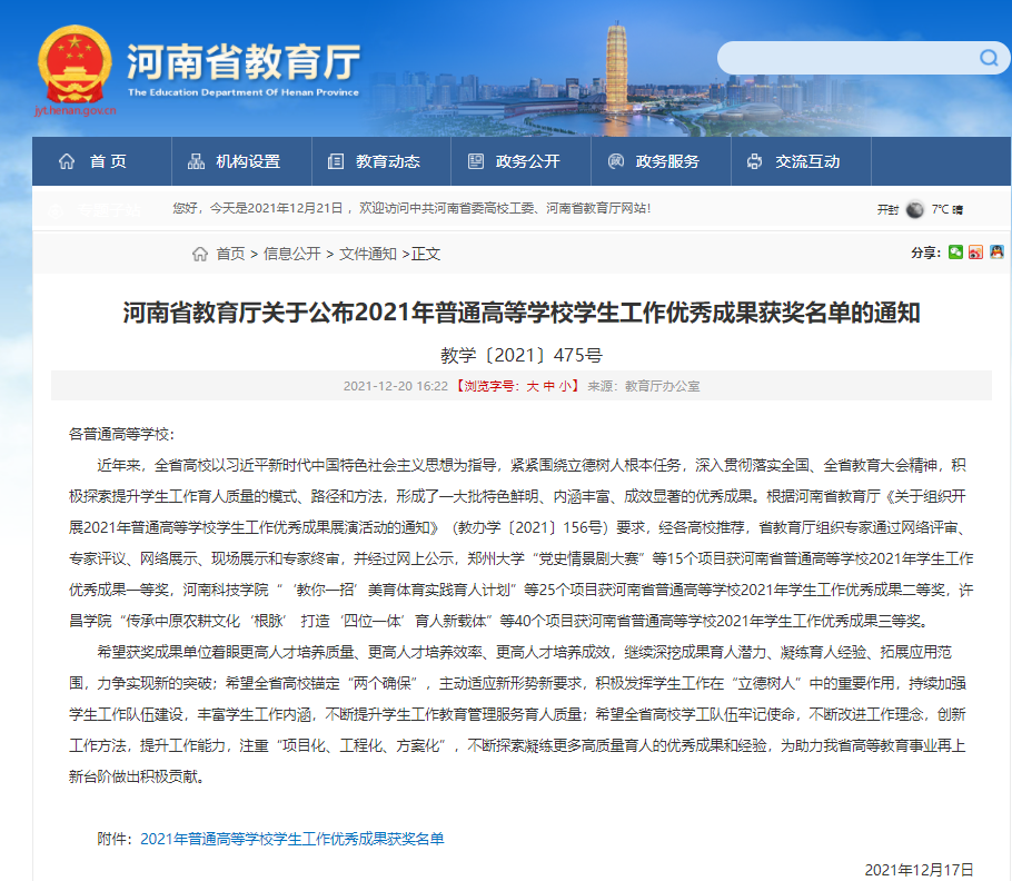 近日,河南省教育厅下发《关于公布2021年普通高等学校学生工作优秀成果获奖名单的通知》(教学〔2021〕475号),我校《“五渠道”打造资助育人新模式》项目在2021年河南省普通高等学校学生工作优秀成果展演中荣获三等奖。