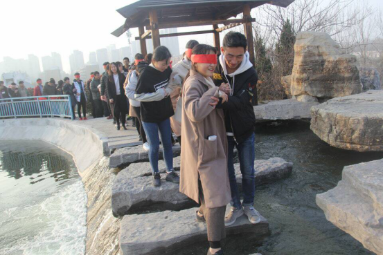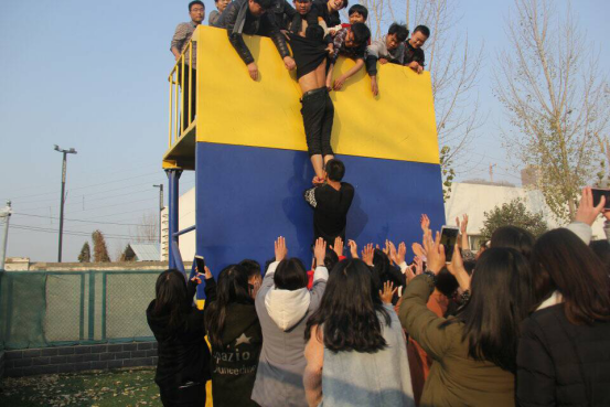 王超老师对本次活动进行了详细的介绍,带领同学们做了爬毕业墙时的主要肢体动作和热身运动,希望大家能够在爬毕业墙的时候注意安全和方式方法,在增强同学们之间的信任和团结的同时,提升了同学们做事的思考能力和解决方法。活动开始,同学们开始分工,有的同学组成人梯,有的同学则帮助别的同学进行爬毕业墙,下面做人梯的同学也不负重任和毕业墙上面的同学配合的特别好,第一次爬毕业墙并没有成功,在规定时间内全部成员没有全体都爬到毕业墙上,在老师的鼓励下,同学们没有放弃,高声喊起要来第二次,第一次的毕业墙也是给同学们的一次锻炼吧!在第二次的爬毕业墙同学们找到了一些技巧,虽然最后一名成员尝试几次都没能成功,但是经过全体同学的不懈努力,最终成功爬上毕业墙。为了检验同学们之间的信任和配合程度,第二次开展“信任盲行”,这次的路程选择了比上次更惊险,从西北操场到鲲鹏山再到六号教学楼,一路上有台阶、有水池、有山体,路程崎岖不平,每组搭档相互帮助,最终全部安全回到教室进行《大学生心理素质量表》和《自我效能感量表》的后测,通过问卷填写和数据分析,检验同学们在素质拓展过程中的成长和收获。